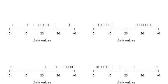 library(StatDA) pdf("fig-3-1.pdf",width=8,height=4) par(mfrow=c(2,2),mar=c(4,2,1,2)) x1=c(2,11,15,18,19.3,20,21,22.5,24,28,37) plot(x1,rep(0.1,length(x1)),xlab="Data values",ylab="",cex.lab=1.2,yaxt="n", frame.plot=F,xlim=c(0,40),ylim=c(0,1),pch=3) x2=c(3,5,6.5,7.8,9,10.1,12,27,28.1,29.4,30.8,32,33.1,35) plot(x2,rep(0.1,length(x2)),xlab="Data values",ylab="",cex.lab=1.2,yaxt="n", frame.plot=F,xlim=c(0,40),ylim=c(0,1),pch=3) x3=c(1,22,29,33,35,36.5,37.5,38.0,38.4,38.8,39) plot(x3,rep(0.1,length(x3)),xlab="Data values",ylab="",cex.lab=1.2,yaxt="n", frame.plot=F,xlim=c(0,40),ylim=c(0,1),pch=3) x4=c(2,2.5,3.1,3.9,4.9,6.2,8,12,17,25,39) plot(x4,rep(0.1,length(x4)),xlab="Data values",ylab="",cex.lab=1.2,yaxt="n", frame.plot=F,xlim=c(0,40),ylim=c(0,1),pch=3) dev.off() |