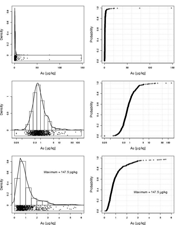 library(StatDA) data(chorizon) # need Au data: Au=chorizon$Au n=length(Au) pdf("fig-3-7.pdf",width=8,height=10) par(mfcol=c(3,2),mar=c(4,4,2,2)) ################### edaplot(Au,H.freq=F,box=F,H.breaks=100,S.pch=3,S.cex=0.5,D.lwd=1.5,P.log=F, P.main="",P.xlab="Au [ g/kg]",P.ylab="Density") mtext(expression(mu),side=1,line=3.05,at=72.9,cex=0.9) ################### edaplot(log10(Au),H.freq=F,box=F,H.breaks=15,S.pch=3,S.cex=0.5,D.lwd=1.5, P.log=T,P.logfine=c(5,10),P.main="",P.xlab="Au [ g/kg]", P.ylab="Density") mtext(expression(mu),side=1,line=3.05,at=0.40,cex=0.9) ################### edaplot(Au,H.freq=F,box=F,H.breaks=290,S.pch=3,S.cex=0.5,D.lwd=1.5,P.log=F, P.main="",P.xlab="Au [ g/kg]",P.ylab="Density",P.xlim=c(0,6)) mtext(expression(mu),side=1,line=3.05,at=2.95,cex=0.9) text(2.5,0.6,paste("Maximum =",round(max(Au),1)," g/kg"),pos=4,cex=1.3) text(4.82,0.585,expression(mu),pos=4,cex=1.4) ##### plot(sort(Au),((1:n)-0.5)/n,pch=3,cex=0.8, main="",xlab="Au [ g/kg]",ylab="Probability",cex.lab=1.4) abline(h=seq(0,1,by=0.1),lty=3,col=gray(0.5)) abline(v=seq(0,150,by=20),lty=3,col=gray(0.5)) mtext(expression(mu),side=1,line=3.05,at=72.9,cex=0.9) ##### plot(sort(log10(Au)),((1:n)-0.5)/n,pch=3,cex=0.8, main="",xlab="Au [ g/kg]",ylab="Probability",xaxt="n",cex.lab=1.4) mtext(expression(mu),side=1,line=3.05,at=0.40,cex=0.9) axis(1,at=log10(alog<-sort(c((10^(-50:50))%*%t(c(5,10))))),labels=alog) abline(h=seq(0,1,by=0.1),lty=3,col=gray(0.5)) abline(v=log10(alog),lty=3,col=gray(0.5)) ##### plot(sort(Au),((1:n)-0.5)/n,pch=3,cex=0.8, main="",xlab="Au [ g/kg]",ylab="Probability",xlim=c(0,6),cex.lab=1.4) abline(h=seq(0,1,by=0.1),lty=3,col=gray(0.5)) abline(v=seq(0,6),lty=3,col=gray(0.5)) mtext(expression(mu),side=1,line=3.05,at=2.95,cex=0.9) text(2.5,0.35,paste("Maximum =",round(max(Au),1)," g/kg"),pos=4,cex=1.3) text(4.82,0.335,expression(mu),pos=4,cex=1.4) dev.off() |