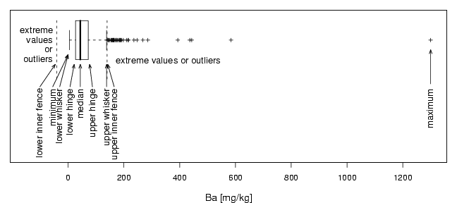 library(StatDA) data(chorizon) x=chorizon[,"Ba"] pdf("fig-3-13.pdf",paper="special",width=9,height=4) par(mar=c(4,1,1,1)) # Boxplot plot(0,0,xlab="Ba [mg/kg]", cex.lab=1.2, xlim=c(-150,1300), ylim=c(-0.2,1.25),yaxt="n",type="n",xaxt="n") axis(1,at= xat <- seq(0,1400,by=200), labels=xat) a=boxplot(x,conf=T, add=TRUE,horizontal=TRUE,pch=3,cex=0.7,yaxt="n",xaxt="n") # Text tcex=1.1 ypos=0.5 text(max(x),ypos,"maximum",cex=tcex,srt=90,adj=c(1,0.4)) arrows(max(x),ypos+0.05,max(x),0.9,length=0.08,angle=20) text(min(x)-60,ypos,"minimum",cex=tcex,srt=90,adj=c(1,0.4)) arrows(min(x)-60,ypos+0.02,min(x)-5,0.85,length=0.08,angle=20) text(a$stats[3],ypos,"median",cex=tcex,srt=90,adj=c(1,0.4)) arrows(a$stats[3],ypos+0.02,a$stats[3],0.75,length=0.08,angle=20) text(a$stats[2]-20,ypos,"lower hinge",cex=tcex,srt=90,adj=c(1,0.4)) arrows(a$stats[2]-20,ypos+0.02,a$stats[2]-5,0.75,length=0.08,angle=20) text(a$stats[4]+15,ypos,"upper hinge",cex=tcex,srt=90,adj=c(1,0.4)) arrows(a$stats[4]+15,ypos+0.02,a$stats[4]+5,0.75,length=0.08,angle=20) text(a$stats[1]-35,ypos,"lower whisker",cex=tcex,srt=90,adj=c(1,0.4)) arrows(a$stats[1]-35,ypos+0.02,a$stats[1]-5,0.85,length=0.08,angle=20) text(a$stats[5],ypos,"upper whisker",cex=tcex,srt=90,adj=c(1,0.4)) arrows(a$stats[5],ypos+0.02,a$stats[5],0.75,length=0.08,angle=20) # IQR iq=a$stats[4]-a$stats[2] # far outliers: farup=a$stats[4]+3*iq # upper inner fence text(a$stats[4]+1.5*iq+25,ypos,"upper inner fence",cex=tcex,srt=90,adj=c(1,0.4)) arrows(a$stats[4]+1.5*iq+25,ypos+0.02,a$stats[4]+1.5*iq+2,0.75,length=0.08,angle=20) segments(a$stats[4]+1.5*iq,0.6,a$stats[4]+1.5*iq,1.2,lty=2) # upper outliers text(a$stats[4]+3*iq+150,0.87,"extreme values or outliers",cex=tcex,pos=1,srt=0,adj=c(0,0)) # lower inner fence text(a$stats[2]-1.5*iq-60,ypos,"lower inner fence",cex=tcex,srt=90,adj=c(1,0.4)) arrows(a$stats[2]-1.5*iq-60,ypos+0.02,a$stats[2]-1.5*iq-5,0.75,length=0.08,angle=20) segments(a$stats[2]-1.5*iq,0.6,a$stats[2]-1.5*iq,1.2,lty=2) # lower outliers text(a$stats[1]-60,1.1,"extreme",srt=0,cex=tcex,adj=c(1,0.4)) text(a$stats[1]-60,1.0,"values",srt=0,cex=tcex,adj=c(1,0.4)) text(a$stats[1]-60,0.9,"or",srt=0,cex=tcex,adj=c(1,0.4)) text(a$stats[1]-60,0.8,"outliers",srt=0,cex=tcex,adj=c(1,0.4)) dev.off() |