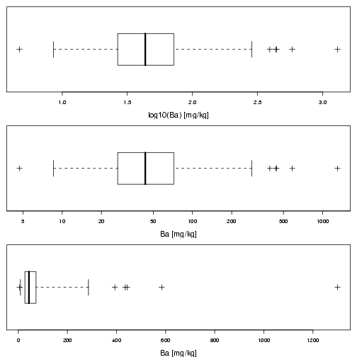 library(StatDA) data(chorizon) Ba=chorizon[,"Ba"] pdf("fig-3-14.pdf",paper="special",width=7,height=7) par(mar=c(4,1,1,1)) par(mfrow=c(3,1)) boxplot(log10(Ba),horizontal=T,xlab="log10(Ba) [mg/kg]",cex.lab=1.4,pch=3, cex=1.5) boxplot(log10(Ba),horizontal=T,xlab="Ba [mg/kg]",cex.lab=1.4,pch=3,xaxt="n") axis(1,at=log10(a<-sort(c((10^(-50:50))%*%t(c(2,5,10))))),labels=a,cex=1.5) boxplotlog((Ba),horizontal=T,xlab="Ba [mg/kg]",cex.lab=1.4,pch=3,cex=1.5) dev.off() |