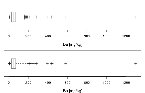 library(StatDA) data(chorizon) Ba=chorizon[,"Ba"] pdf("fig-3-15.pdf",paper="special",width=7,height=4.5) par(mar=c(4,1,1,1)) par(mfrow=c(2,1)) boxplotperc(Ba,quant=c(0.05,0.95),horizontal=T,xlab="Ba [mg/kg]",cex.lab=1.2,pch=3) boxplotperc(Ba,quant=c(0.02,0.98),horizontal=T,xlab="Ba [mg/kg]",cex.lab=1.2,pch=3) |
