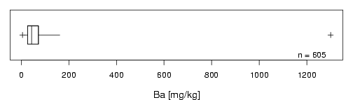 library(StatDA) data(chorizon) Ba=chorizon[,"Ba"] pdf("fig-3-16.pdf",paper="special",width=7,height=2) par(mar=c(4,1,1,1)) rg.boxplot(Ba,ifbw=T,colr=0,xlab="Ba [mg/kg]",cex.lab=1.2) dev.off() |