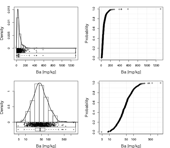 # Fig. 3.17.: ECDF combined with histogram, density trace, scattergram, Boxplot for Ba