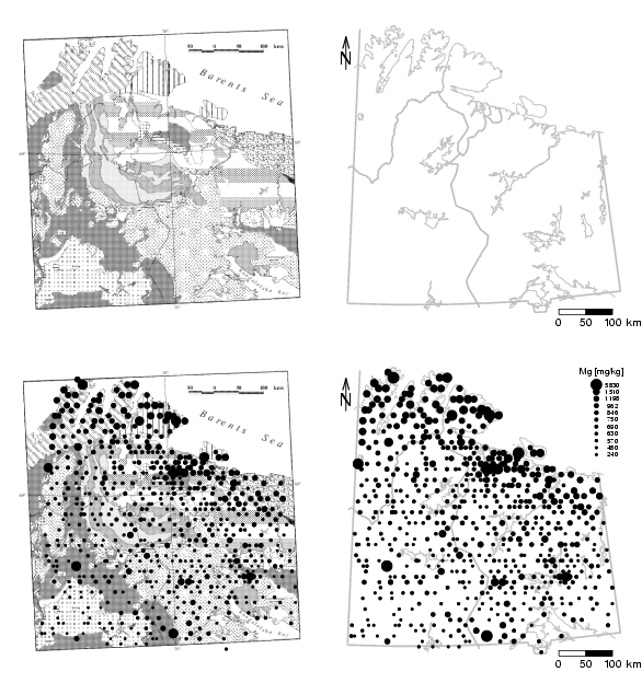 library(StatDA) data(kola.background) data(ohorizon) el=ohorizon[,"Mg"] X=ohorizon[,"XCOO"] Y=ohorizon[,"YCOO"] # true representation of x and y axis of map for plot xwid=diff(range(X))/12e4 ywid=diff(range(Y))/12e4 pdf("fig-5-1.pdf",width=2*xwid,height=2*ywid) par(mfrow=c(2,2),mar=c(1.5,1.5,1.5,1.5)) # Read map: m=read.pnm("backgroundmap.pnm") plot(m[1:500,1:494]) # generate plot with packground plot(X,Y,frame.plot=FALSE,xaxt="n",yaxt="n",xlab="",ylab="",type="n") plotbg(map.col=c("gray","gray","gray","gray"),add.plot=T) # scalebar scalebar(761309,7373050,861309,7363050,shifttext=-0.5,shiftkm=4e4,sizetext=0.8) # North arrow Northarrow(362602,7818750,362602,7878750,362602,7838750,Alength=0.15,Aangle=15,Alwd=1.3,Tcex=1.6) ### NEW MAP: plot(m[1:500,1:494]) bubbleFIN(X/1100-300,Y/1100-6690,el,radi=8,S=9,s=2,plottitle="",legendtitle="Mg [mg/kg]", text.cex=0.63,leg=F,ndigits=1) # Percentile legend text(min(X)+diff(range(X))*5/8,max(Y),"Growing dots:",cex=0.63) text(min(X)+diff(range(X))*5/8,max(Y)-diff(range(Y))/25,"Finnish method",cex=0.63) ### NEW MAP: # generate plot with packground plot(X,Y,frame.plot=FALSE,xaxt="n",yaxt="n",xlab="",ylab="",type="n") plotbg(map.col=c("gray","gray","gray","gray"),add.plot=T) bubbleFIN(X,Y,el,S=9,s=2,plottitle="",legendtitle="Mg [mg/kg]", text.cex=0.63,legtitle.cex=0.80) # Percentile legend ##text(min(X)+diff(range(X))*5/8,max(Y),"Growing dots:",cex=0.63) ##text(min(X)+diff(range(X))*5/8,max(Y)-diff(range(Y))/25,"Finnish method",cex=0.63) # scalebar scalebar(761309,7373050,861309,7363050,shifttext=-0.5,shiftkm=4e4,sizetext=0.8) # North arrow Northarrow(362602,7818750,362602,7878750,362602,7838750,Alength=0.15,Aangle=15,Alwd=1.3,Tcex=1.6) dev.off() |