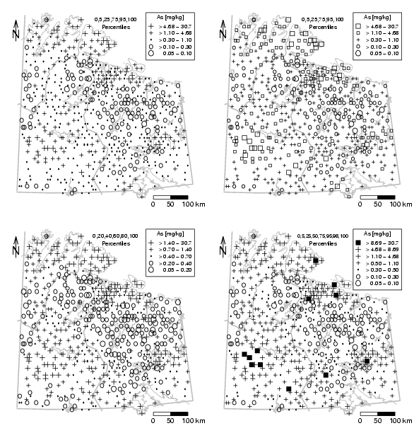 library(StatDA) data(chorizon) data(kola.background) el=chorizon[,"As"] X=chorizon[,"XCOO"] Y=chorizon[,"YCOO"] # true representation of x and y axis of map for plot xwid=diff(range(X))/12e4 ywid=diff(range(Y))/12e4 pdf("fig-5-4.pdf",width=2*xwid,height=2*ywid) par(mfrow=c(2,2),mar=c(1.5,1.5,1.5,1.5)) ### NEW MAP: EDA 5 # generate plot with background plot(X,Y,frame.plot=FALSE,xaxt="n",yaxt="n",xlab="",ylab="",type="n") plotbg(map.col=c("gray","gray","gray","gray"),add.plot=T) SymbLegend(X,Y,el,type="percentile",qutiles<-c(0,0.05,0.25,0.75,0.95,1),symbtype="EDA",symbmagn=0.8, leg.position="topright",leg.title="As [mg/kg]",leg.title.cex=0.8,leg.round=2,leg.wid=4,leg.just="right") # Text text(min(X)+diff(range(X))*4/7,max(Y),paste(qutiles*100,collapse=","),cex=0.8) text(min(X)+diff(range(X))*4/7,max(Y)-diff(range(Y))/25,"Percentiles",cex=0.8) # scalebar scalebar(761309,7373050,861309,7363050,shifttext=-0.5,shiftkm=37e3,sizetext=0.8) # North arrow Northarrow(362602,7818750,362602,7878750,362602,7838750,Alength=0.15,Aangle=15,Alwd=1.3,Tcex=1.6) ### NEW MAP: GSC 5 # generate plot with background plot(X,Y,frame.plot=FALSE,xaxt="n",yaxt="n",xlab="",ylab="",type="n") plotbg(map.col=c("gray","gray","gray","gray"),add.plot=T) SymbLegend(X,Y,el,type="percentile",qutiles<-c(0,0.05,0.25,0.75,0.95,1),symbtype="GSC",symbmagn=0.8, leg.position="topright",leg.title="As [mg/kg]",leg.title.cex=0.8,leg.round=2,leg.wid=4,leg.just="right") # Text text(min(X)+diff(range(X))*4/7,max(Y),paste(qutiles*100,collapse=","),cex=0.8) text(min(X)+diff(range(X))*4/7,max(Y)-diff(range(Y))/25,"Percentiles",cex=0.8) # scalebar scalebar(761309,7373050,861309,7363050,shifttext=-0.5,shiftkm=37e3,sizetext=0.8) # North arrow Northarrow(362602,7818750,362602,7878750,362602,7838750,Alength=0.15,Aangle=15,Alwd=1.3,Tcex=1.6) ### NEW MAP: EDA , other percentiles # generate plot with background plot(X,Y,frame.plot=FALSE,xaxt="n",yaxt="n",xlab="",ylab="",type="n") plotbg(map.col=c("gray","gray","gray","gray"),add.plot=T) SymbLegend(X,Y,el,type="percentile",qutiles<-c(0,0.20,0.40,0.60,0.80,1),symbtype="EDA",symbmagn=0.8, leg.position="topright",leg.title="As [mg/kg]",leg.title.cex=0.8,leg.round=2,leg.wid=4,leg.just="right") # Text text(min(X)+diff(range(X))*4/7,max(Y),paste(qutiles*100,collapse=","),cex=0.8) text(min(X)+diff(range(X))*4/7,max(Y)-diff(range(Y))/25,"Percentiles",cex=0.8) # scalebar scalebar(761309,7373050,861309,7363050,shifttext=-0.5,shiftkm=37e3,sizetext=0.8) # North arrow Northarrow(362602,7818750,362602,7878750,362602,7838750,Alength=0.15,Aangle=15,Alwd=1.3,Tcex=1.6) ### NEW MAP: EDA 7 # generate plot with packground plot(X,Y,frame.plot=FALSE,xaxt="n",yaxt="n",xlab="",ylab="",type="n") plotbg(map.col=c("gray","gray","gray","gray"),add.plot=T) SymbLegend(X,Y,el,type="percentile",qutiles<-c(0,0.05,0.25,0.5,0.75,0.95,0.98,1),symbtype="EDAacc2",symbmagn=0.8, leg.position="topright",leg.title="As [mg/kg]",leg.title.cex=0.8,leg.round=2,leg.wid=4,leg.just="right") # Text text(min(X)+diff(range(X))*4/7,max(Y),paste(qutiles*100,collapse=","),cex=0.73) text(min(X)+diff(range(X))*4/7,max(Y)-diff(range(Y))/25,"Percentiles",cex=0.8) # scalebar scalebar(761309,7373050,861309,7363050,shifttext=-0.5,shiftkm=37e3,sizetext=0.8) # North arrow Northarrow(362602,7818750,362602,7878750,362602,7838750,Alength=0.15,Aangle=15,Alwd=1.3,Tcex=1.6) dev.off() |