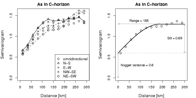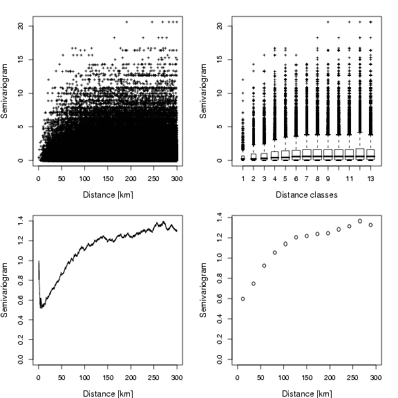 library(StatDA) # variogram example data(chorizon) data(kola.background) # Krige results: pdf("fig-5-7.pdf",width=8, height=8) par(mfrow=c(2,2),mar=c(4,4,2,2)) # As in C-Horizon X=chorizon[,"XCOO"]/1000 Y=chorizon[,"YCOO"]/1000 el=chorizon[,"As"] # binned variogram vario.b <- variog(coords=cbind(X,Y), data=el, lambda=0, max.dist=300) # variogram cloud vario.c <- variog(coords=cbind(X,Y), data=el, lambda=0, max.dist=300, op="cloud") #binned variogram and stores the cloud vario.bc <- variog(coords=cbind(X,Y), data=el, lambda=0, max.dist=300, bin.cloud=TRUE) # smoothed variogram vario.s <- variog(coords=cbind(X,Y), data=el, lambda=0, max.dist=300, op="sm", band=10) # plotting the variograms: plotvario(vario.c,xlab="Distance [km]", ylab="Semivariogram",cex.lab=1.2,max.dist=300,pch=3,cex=0.5) plotvario(vario.bc, bin.cloud=TRUE, xlab="Distance classes",ylab="Semivariogram",cex.lab=1.2) plotvario(vario.s, type="l", xlab="Distance [km]",ylab="Semivariogram",cex.lab=1.2,max.dist=300) plotvario(vario.b,xlab="Distance [km]",ylab="Semivariogram",cex.lab=1.2,max.dist=300,pch=1,cex=1) dev.off() |