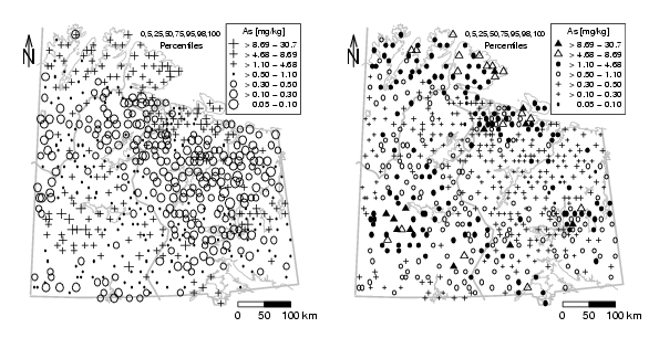 library(StatDA) data(chorizon) data(kola.background) el=chorizon[,"As"] X=chorizon[,"XCOO"] Y=chorizon[,"YCOO"] # true representation of x and y axis of map for plot xwid=diff(range(X))/12e4 ywid=diff(range(Y))/12e4 pdf("fig-5-13.pdf",width=2*xwid,height=1*ywid) par(mfrow=c(1,2),mar=c(1.5,1.5,1.5,1.5)) ### NEW MAP: EDA 7 # generate plot with background plot(X,Y,frame.plot=FALSE,xaxt="n",yaxt="n",xlab="",ylab="",type="n") plotbg(map.col=c("gray","gray","gray","gray"),add.plot=T) SymbLegend(X,Y,el,type="percentile",qutiles<-c(0,0.05,0.25,0.5,0.75,0.95,0.98,1), symbtype="EDAext",symbmagn=0.7, leg.position="topright",leg.title="As [mg/kg]", leg.title.cex=0.63,leg.round=2,leg.wid=4,leg.just="right") # Text text(min(X)+diff(range(X))*4/7,max(Y),paste(qutiles*100,collapse=","),cex=0.62) text(min(X)+diff(range(X))*4/7,max(Y)-diff(range(Y))/25,"Percentiles",cex=0.7) # scalebar scalebar(761309,7373050,861309,7363050,shifttext=-0.5,shiftkm=37e3,sizetext=0.8) # North arrow Northarrow(362602,7818750,362602,7878750,362602,7838750,Alength=0.15,Aangle=15,Alwd=1.3,Tcex=1.6) ### NEW MAP: Arbitrary # generate plot with background plot(X,Y,frame.plot=FALSE,xaxt="n",yaxt="n",xlab="",ylab="",type="n") plotbg(map.col=c("gray","gray","gray","gray"),add.plot=T) SymbLegend(X,Y,el,type="percentile",qutiles<-c(0,0.05,0.25,0.5,0.75,0.95,0.98,1), symbtype="arbit",symbmagn=0.8, leg.position="topright",leg.title="As [mg/kg]", leg.title.cex=0.63,leg.round=2,leg.wid=4,leg.just="right") # Text text(min(X)+diff(range(X))*4/7,max(Y),paste(qutiles*100,collapse=","),cex=0.62) text(min(X)+diff(range(X))*4/7,max(Y)-diff(range(Y))/25,"Percentiles",cex=0.7) # scalebar scalebar(761309,7373050,861309,7363050,shifttext=-0.5,shiftkm=37e3,sizetext=0.8) # North arrow Northarrow(362602,7818750,362602,7878750,362602,7838750,Alength=0.15,Aangle=15,Alwd=1.3,Tcex=1.6) dev.off() |