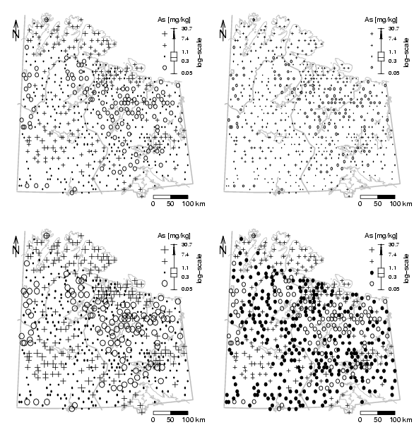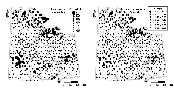 library(StatDA) data(chorizon) data(kola.background) el=chorizon[,"As"] X=chorizon[,"XCOO"] Y=chorizon[,"YCOO"] # true representation of x and y axis of map for plot xwid=diff(range(X))/12e4 ywid=diff(range(Y))/12e4 pdf("fig-5-15.pdf",width=2*xwid,height=1*ywid) par(mfrow=c(1,2),mar=c(1.5,1.5,1.5,1.5)) ### NEW MAP: # generate plot with packground plot(X,Y,frame.plot=FALSE,xaxt="n",yaxt="n",xlab="",ylab="",type="n") plotbg(map.col=c("gray","gray","gray","gray"),add.plot=T) bubbleFIN(X,Y,el,S=9,s=2,plottitle="",legendtitle="As [mg/kg]", text.cex=0.63, legtitle.cex=0.70,ndigits=2) # Percentile legend text(min(X)+diff(range(X))*5/7,max(Y),"Exponentially",cex=0.70) text(min(X)+diff(range(X))*5/7,max(Y)-diff(range(Y))/25,"growing dots",cex=0.70) # scalebar scalebar(761309,7373050,861309,7363050,shifttext=-0.5,shiftkm=4e4,sizetext=0.8) # North arrow Northarrow(362602,7818750,362602,7878750,362602,7838750,Alength=0.15,Aangle=15,Alwd=1.3,Tcex=1.6) ### NEW MAP: # take symbols according to quantiles: qu=c(0,0.1,0.25,0.5,0.75,0.90,0.95,1) q=quantile(el, qu) # symbols and size symb=c(16,16,16,16,16,16,16) ssize=c(0.3,0.5,0.7,0.9,1.1,1.3,1.7)*0.63 # generate plot with packground plot(X,Y,frame.plot=FALSE,xaxt="n",yaxt="n",xlab="",ylab="",type="n") plotbg(map.col=c("gray","gray","gray","gray"),add.plot=T) # plot symbols: for (i in 1:(length(qu)-1)){ points(X[el>=q[i] & el =q[i] & el} |
