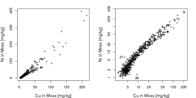 library(StatDA) data(moss) # Country Cu=moss[,"Cu"] Ni=moss[,"Ni"] pdf("fig-6-1.pdf",width=9,height=4.5) par(mfrow=c(1,2),mar=c(4,4,2,2)) plot(Cu,Ni,xlab="Cu in Moss [mg/kg]", ylab="Ni in Moss [mg/kg]",pch=3, cex=0.7,cex.lab=1.2) plot(log10(Cu),log10(Ni),xlab="Cu in Moss [mg/kg]", ylab="Ni in Moss [mg/kg]", xaxt="n", yaxt="n", pch=3, cex=0.7,cex.lab=1.2) axis(1,at=log10(a<-sort(c((10^(-50:50))%*%t(c(2,5,10))))),labels=a) axis(2,at=log10(a<-sort(c((10^(-50:50))%*%t(c(2,5,10))))),labels=a) text(log10(9.1),-0.02,moss[30,"ID"]) text(log10(3.3),0.8,moss[31,"ID"]) dev.off() |