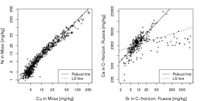library(StatDA) pdf("fig-6-4.pdf",width=9,height=4.5) par(mfrow=c(1,2),mar=c(4,4,2,2)) # left plot: data(moss) Cu=moss[,"Cu"] Ni=moss[,"Ni"] plot(log10(Cu),log10(Ni), pch=3, cex=0.7, cex.lab=1.2,xaxt="n", yaxt="n", xlab="Cu in Moss [mg/kg]", ylab="Ni in Moss [mg/kg]") axis(1,at=log10(a<-sort(c((10^(-50:50))%*%t(c(2,5,10))))),labels=a) axis(2,at=log10(a<-sort(c((10^(-50:50))%*%t(c(2,5,10))))),labels=a) abline(lsfit(log10(Cu),log10(Ni)),lty=2) abline(ltsReg(log10(Cu),log10(Ni))) legend("bottomright",legend=c("Robust line","LS line"),lty=c(1,2)) # right plot: data(chorizon) coun=chorizon[,"COUN"] Sr=chorizon[coun=="RUS","Sr"] Ca=chorizon[coun=="RUS","Ca"] plot(log10(Sr),log10(Ca), pch=3, cex=0.7, cex.lab=1.2,xaxt="n", yaxt="n", xlab="Sr in C-horizon, Russia [mg/kg]", ylab="Ca in C-horizon, Russia [mg/kg]") axis(1,at=log10(a<-sort(c((10^(-50:50))%*%t(c(2,5,10))))),labels=a) axis(2,at=log10(a<-sort(c((10^(-50:50))%*%t(c(2,5,10))))),labels=a) abline(lsfit(log10(Sr),log10(Ca)),lty=2) abline(ltsReg(log10(Sr),log10(Ca))) legend("bottomright",legend=c("Robust line","LS line"),lty=c(1,2)) dev.off() |