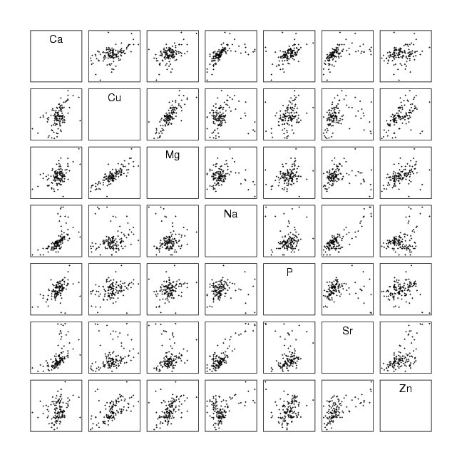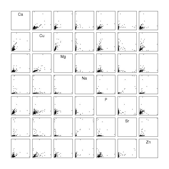 library(StatDA) data(chorizon) pdf("fig-6-13.pdf",width=9,height=9) par(mfrow=c(1,1),mar=c(0.1,0.1,0.1,0.1)) x=chorizon[,c("Ca","Cu","Mg","Na","P","Sr","Zn")] lit=chorizon[,"LITO"] litolog=rep(NA, length(lit)) litolog[lit==10] <- 1 litolog[lit==52] <- 2 litolog[lit==81 | lit==82 | lit==83] <- 3 litolog[lit==7] <- 4 x.sub <- x[!is.na(litolog),] litolog <- litolog[!is.na(litolog)] litolog <- factor(litolog, labels=c("AB","PG","AR","LPS")) scatterplot.matrix(x.sub, diagonal="none", smooth=F, reg.line=F, robust=F, ellipse=F, transform=F, groups=F, by.groups=F, pch=3, col=rep(1,length(litolog)), lwd=1, cex=0.3, cex.labels=1.9, legend.plot=F,xaxt="n",yaxt="n") dev.off() |