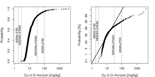 library(StatDA) data(ohorizon) el=log10(ohorizon[,"Cu"]) pdf("fig-7-1.pdf",width=9,height=4.5) par(mfcol=c(1,2),mar=c(4,4,2,2)) n=length(el) plot(sort(el),((1:n)-0.5)/n,pch=3,cex=0.8,xlim=c(0.1,max(el)), main="",xlab="Cu in O-horizon [mg/kg]",ylab="Probability",cex.lab=1,xaxt="n",cex.lab=1.2) axis(1,at=log10(alog<-sort(c((10^(-50:50))%*%t(c(10))))),labels=alog) #abline(h=seq(0,1,by=0.1),lty=3,col=gray(0.5)) #abline(v=log10(alog),lty=3,col=gray(0.5)) abline(v=c(mean(el)-2*sd(el),mean(el)+2*sd(el)),lty=2) text(mean(el)-2*sd(el),0.5,"MEAN-2*SD",srt=90,adj=c(0.5,-0.3),cex=0.9) text(mean(el)+2*sd(el),0.3,"MEAN+2*SD",srt=90,adj=c(0.5,-0.3),cex=0.9) abline(v=c(median(el)-2*mad(el),median(el)+2*mad(el)),lty=4) text(median(el)-2*mad(el),0.5,"MEDIAN-2*MAD",srt=90,adj=c(0.5,-0.3),cex=0.9) text(median(el)+2*mad(el),0.3,"MEDIAN+2*MAD",srt=90,adj=c(0.5,-0.3),cex=0.9) qpplot.das(el,qdist=qnorm,xlab="Cu in O-horizon [mg/kg]", ylab="Probability [%]", pch=3,cex=0.7, logx=TRUE, logfinetick=c(0),logfinelab=c(10),cex.lab=1.2,gridy=FALSE, xlim=c(0.1,max(el))) #axis(1,at=log10(alog<-sort(c((10^(-50:50))%*%t(c(5,10))))),labels=alog) #abline(v=log10(alog),lty=3,col=gray(0.5)) abline(v=c(mean(el)-2*sd(el),mean(el)+2*sd(el)),lty=2) text(mean(el)-2*sd(el),0.5,"MEAN-2*SD",srt=90,adj=c(0.5,-0.3),cex=0.9) text(mean(el)+2*sd(el),-1.2,"MEAN+2*SD",srt=90,adj=c(0.5,-0.3),cex=0.9) abline(v=c(median(el)-2*mad(el),median(el)+2*mad(el)),lty=4) text(median(el)-2*mad(el),0.5,"MEDIAN-2*MAD",srt=90,adj=c(0.5,-0.3),cex=0.9) text(median(el)+2*mad(el),-1.2,"MEDIAN+2*MAD",srt=90,adj=c(0.5,-0.3),cex=0.9) |