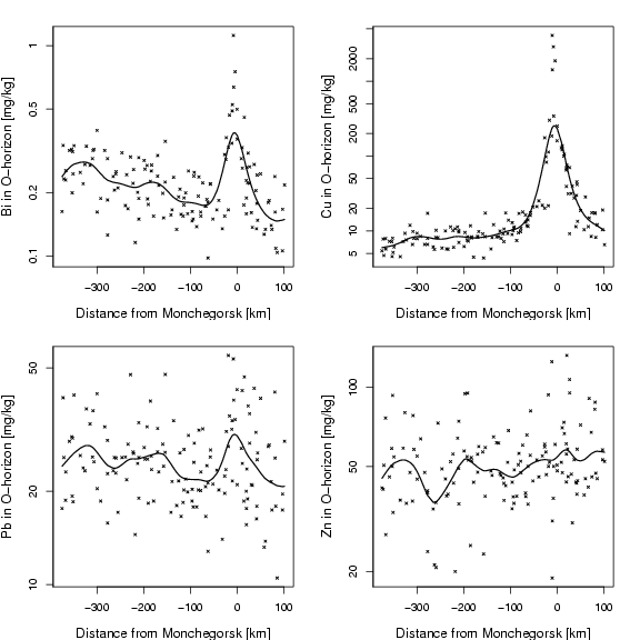 library(StatDA) data(ohorizon) X=ohorizon[,"XCOO"] Y=ohorizon[,"YCOO"] pdf("fig-7-5.pdf",width=8,height=8) par(mfrow=c(2,2),mar=c(4,4,2,2)) ##################################################### x1h=(X[Y<7600000 & Y>7500000]-753970)/1000 y1h=log10(ohorizon[Y<7600000 & Y>7500000,"Bi"]) plot(x1h,y1h,xlab="Distance from Monchegorsk [km]",ylab="Bi in O-horizon [mg/kg]",pch=4,cex=0.5, yaxt="n",col=1,cex.lab=1.2) axis(2,at=log10(a<-sort(c((10^(-50:50))%*%t(c(2,5,10))))),labels=a) lines(smooth.spline(x1h,y1h,spar=0.7),col=1,lwd=1.4,lty=1) ##################################################### x1h=(X[Y<7600000 & Y>7500000]-753970)/1000 y1h=log10(ohorizon[Y<7600000 & Y>7500000,"Cu"]) plot(x1h,y1h,xlab="Distance from Monchegorsk [km]",ylab="Cu in O-horizon [mg/kg]",pch=4,cex=0.5, yaxt="n",col=1,cex.lab=1.2) axis(2,at=log10(a<-sort(c((10^(-50:50))%*%t(c(2,5,10))))),labels=a) lines(smooth.spline(x1h,y1h,spar=0.7),col=1,lwd=1.4,lty=1) ##################################################### x1h=(X[Y<7600000 & Y>7500000]-753970)/1000 y1h=log10(ohorizon[Y<7600000 & Y>7500000,"Pb"]) plot(x1h,y1h,xlab="Distance from Monchegorsk [km]",ylab="Pb in O-horizon [mg/kg]",pch=4,cex=0.5, yaxt="n",col=1,cex.lab=1.2) axis(2,at=log10(a<-sort(c((10^(-50:50))%*%t(c(2,5,10))))),labels=a) lines(smooth.spline(x1h,y1h,spar=0.7),col=1,lwd=1.4,lty=1) ##################################################### x1h=(X[Y<7600000 & Y>7500000]-753970)/1000 y1h=log10(ohorizon[Y<7600000 & Y>7500000,"Zn"]) plot(x1h,y1h,xlab="Distance from Monchegorsk [km]",ylab="Zn in O-horizon [mg/kg]",pch=4,cex=0.5, yaxt="n",col=1,cex.lab=1.2) axis(2,at=log10(a<-sort(c((10^(-50:50))%*%t(c(2,5,10))))),labels=a) lines(smooth.spline(x1h,y1h,spar=0.7),col=1,lwd=1.4,lty=1) dev.off() |