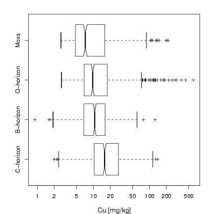 # Fig. 9.7.: Boxplot comparison Cu in B- and C-Horizon, moss, ohorizon