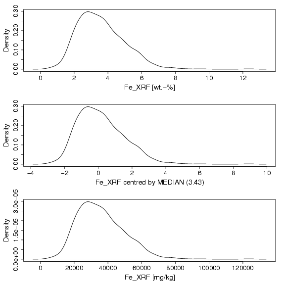 library(StatDA) data(chorizon) Fe=chorizon[,"Fe_XRF"]/10000 pdf("fig-10-5.pdf",width=8,height=8) par(mfrow=c(3,1),mar=c(5,5,2,2)) plot(density(Fe),main="",xlab="Fe_XRF [wt.-%]",cex.lab=1.8,cex.axis=1.6) plot(density(Fe-3.43),main="",xlab="Fe_XRF centred by MEDIAN (3.43)", cex.lab=1.8,cex.axis=1.6) plot(density(Fe*10000),main="",xlab="Fe_XRF [mg/kg]",cex.lab=1.8,cex.axis=1.6) dev.off() |