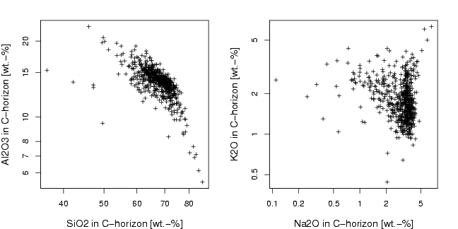 library(StatDA) data(chorizon) x=chorizon[,c("Al2O3","CaO","Fe2O3","K2O","MgO","MnO","Na2O","P2O5","SiO2","TiO2")] pdf("fig-10-7.pdf",width=9,height=4.5) par(mfrow=c(1,2),mar=c(4,4,2,2)) plot(log10(x[,"SiO2"]),log10(x[,"Al2O3"]), xlab="SiO2 in C-horizon [wt.-%]",ylab="Al2O3 in C-horizon [wt.-%]", cex.lab=1.2, pch=3, cex=0.7, xaxt="n", yaxt="n") axis(1,at=log10(a<-sort(c((10^(-50:50))%*%t(c(2,3,4,5,6,7,8,9,10))))),labels=a) axis(2,at=log10(a<-sort(c((10^(-50:50))%*%t(c(1.5,2,3,4,5,6,7,8,10))))),labels=a) plot(log10(x[,"Na2O"]),log10(x[,"K2O"]), xlab="Na2O in C-horizon [wt.-%]",ylab="K2O in C-horizon [wt.-%]", cex.lab=1.2, pch=3, cex=0.7, xaxt="n", yaxt="n") axis(1,at=log10(a<-sort(c((10^(-50:50))%*%t(c(2,5,10))))),labels=a) axis(2,at=log10(a<-sort(c((10^(-50:50))%*%t(c(2,5,10))))),labels=a) dev.off() |