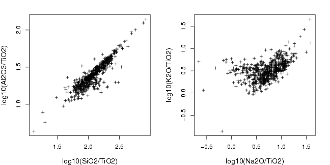 library(StatDA) data(chorizon) x=chorizon[,c("Al2O3","CaO","Fe2O3","K2O","MgO","MnO","Na2O","P2O5","SiO2","TiO2")] x1=x/x[,"TiO2"] x1.obj=log10(x1[,1:9]) pdf("fig-10-8.pdf",width=9,height=4.5) par(mfrow=c(1,2),mar=c(4,4,2,2)) plot(x1.obj[,"SiO2"],x1.obj[,"Al2O3"],xlab="log10(SiO2/TiO2)",ylab="log10(Al2O3/TiO2)", pch=3,cex=0.7,cex.lab=1.2) plot(x1.obj[,"Na2O"],x1.obj[,"K2O"],xlab="log10(Na2O/TiO2)",ylab="log10(K2O/TiO2)", pch=3,cex=0.7,cex.lab=1.2) dev.off() |
