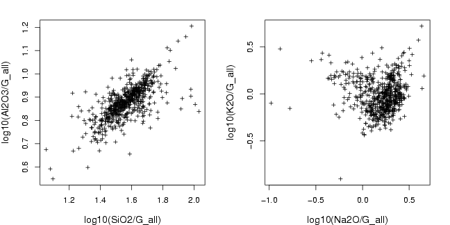 library(StatDA) data(chorizon) x=chorizon[,c("Al2O3","CaO","Fe2O3","K2O","MgO","MnO","Na2O","P2O5","SiO2","TiO2","LOI")] xgeom=10^apply(log10(x),1,mean) x2=x/xgeom x2.obj=log10(x2) pdf("fig-10-9.pdf",width=9,height=4.5) par(mfrow=c(1,2),mar=c(4,4,2,2)) plot(x2.obj[,"SiO2"],x2.obj[,"Al2O3"],xlab="log10(SiO2/G_all)",ylab="log10(Al2O3/G_all)", pch=3,cex=0.7,cex.lab=1.2) plot(x2.obj[,"Na2O"],x2.obj[,"K2O"],xlab="log10(Na2O/G_all)",ylab="log10(K2O/G_all)", pch=3,cex=0.7,cex.lab=1.2) dev.off() |