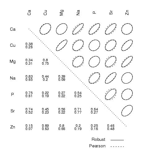 library(StatDA) data(chorizon) x=chorizon[,c("Ca","Cu","Mg","Na","P","Sr","Zn")] pdf("fig-11-4.pdf",width=7,height=7) par(mfrow=c(1,1),mar=c(4,4,2,0)) R=covMcd(log10(x),cor=T)$cor P=cor(log10(x)) CorCompare(R,P,labels1=dimnames(x)[[2]],labels2=dimnames(x)[[2]], method1="Robust",method2="Pearson",ndigits=2, cex.label=1.2) dev.off() |