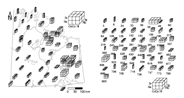 library(StatDA) data(ohorizon) X=ohorizon[,"XCOO"] Y=ohorizon[,"YCOO"] el=log10(ohorizon[,c("Co","Cu","Ni","Rb","Bi","Na","Sr")]) data(kola.background) sel <- c(3,8,22, 29, 32, 35, 43, 69, 73 ,93,109,129,130,134,168,181,183,205,211, 218,237,242,276,292,297,298,345,346,352,372,373,386,408,419,427,441,446,490, 516,535,551,556,558,564,577,584,601,612,617) x=el[sel,] dimnames(x)[[1]]=ohorizon[sel,1] # true representation of x and y axis of map for plot xwid=diff(range(X))/12e4 ywid=diff(range(Y))/12e4 pdf("fig-12-6.pdf",width=2*xwid,height=1*ywid) par(mfrow=c(1,2),mar=c(1.5,1.5,1.5,1.5)) plot(X,Y,frame.plot=FALSE,xaxt="n",yaxt="n",xlab="",ylab="",type="n", xlim=c(360000,max(X))) plotbg(map.col=c("gray","gray","gray","gray"),add.plot=T) boxes(x,locations=cbind(X[sel],Y[sel]),len=20000,key.loc=c(800000,7830000),leglen=25000, cex=0.75, add=T, labels=NULL, lwd=1.1) # scalebar scalebar(761309,7373050,861309,7363050,shifttext=-0.5,shiftkm=37e3,sizetext=0.8) # North arrow Northarrow(362602,7818750,362602,7878750,362602,7838750,Alength=0.15,Aangle=15,Alwd=1.3,Tcex=1.6) par(mar=c(.1,.1,.1,.1)) boxes(x,key.loc=c(15,0.5),len=0.7, leglen=0.8, ncol=8, cex=0.75, lwd=1.1) dev.off() |
