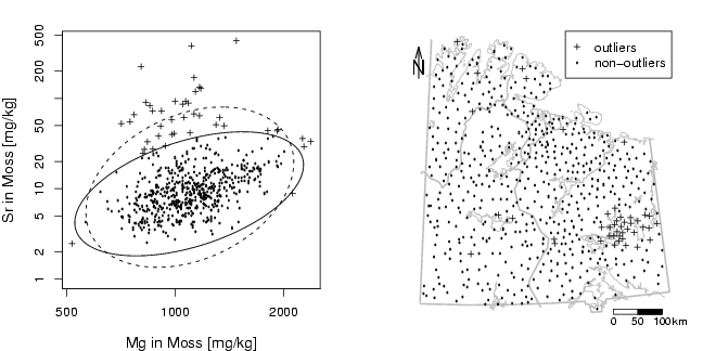 # Fig. 13.3.: Multivariate outlier detection for Mg, Sr in Moss