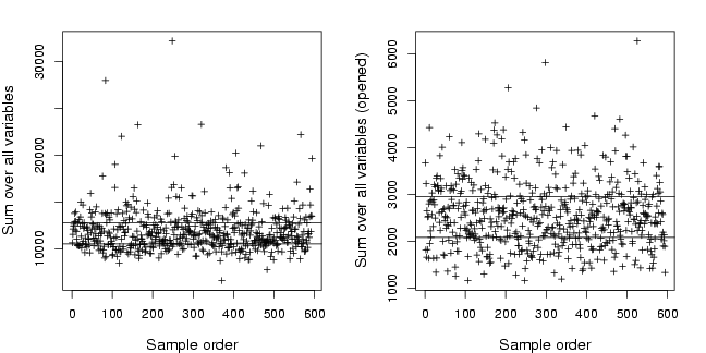 # Fig 14.1: Row sums for log-transformed and log-centred data
