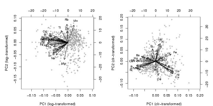 library(StatDA) data(moss) X=moss[,"XCOO"] Y=moss[,"YCOO"] sel=c("Ag","Al","As","B","Ba","Bi","Ca","Cd","Co","Cr","Cu","Fe","Hg","K","Mg", "Mn","Mo","Na","Ni","P","Pb","Rb","S","Sb","Si","Sr","Th","Tl","U","V","Zn") x=moss[,sel] ## Closure problem with log-ratio transformation res.cla=princomp(log10(x),cor=TRUE) # Closure problem with log-centring transformation xgeom=10^apply(log10(x),1,mean) x2=x/xgeom x2.obj=log10(x2) res2=princomp(x2.obj,cor=TRUE) pdf("fig-14-4.pdf",width=10,height=5) par(mfcol=c(1,2),mar=c(4,4,4,2)) # supress text for Hg and print extra: dimnames(res.cla$loa)[[1]][13] <- " " biplot(res.cla,xlab="PC1 (log-transformed)",ylab="PC2 (log-transformed)",col=c(gray(0.6),1),xlabs=rep("+",nrow(x)),cex=0.8) text(-6,2,"Hg",col=1,cex=0.8) biplot(res2,xlab="PC1 (clr-transformed)",ylab="PC2 (clr-transformed)",col=c(gray(0.6),1),xlabs=rep("+",nrow(x)),cex=0.8) dev.off() |