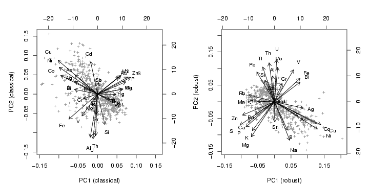 # Fig 14.7: Biplot for classical and robust ilr transformed PCA
