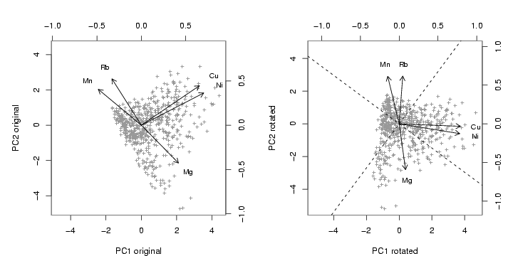 library(StatDA) data(moss) sel=c("Ag","Al","As","B","Ba","Bi","Ca","Cd","Co","Cr","Cu","Fe","Hg","K","Mg", "Mn","Mo","Na","Ni","P","Pb","Rb","S","Sb","Si","Sr","Th","Tl","U","V","Zn") x=log10(moss[,sel]) var=c("Ni","Cu","Mg","Rb","Mn") x=x[,var] set.seed(100) x.mcd=covMcd(x,cor=TRUE) x.rsc=scale(x,x.mcd$cent,sqrt(diag(x.mcd$cov))) res0=pfa(x.rsc,factors=2,covmat=x.mcd,scores="regression",rotation="none", maxit=0,start=rep(0,ncol(x.rsc))) res1=pfa(x.rsc,factors=2,covmat=x.mcd,scores="regression",rotation="varimax", maxit=0,start=rep(0,ncol(x.rsc))) pdf("fig-14-8.pdf",width=10,height=5) par(mfcol=c(1,2),mar=c(4,4,4,2)) par(pty="s") biplot(res0$sco[,1:2],res0$loa[,1:2], xlab="PC1 original",ylab="PC2 original",col=c(gray(0.6),1),xlabs=rep("+",nrow(x)),cex=0.8) biplot(res1$sco[,1:2],res1$loa[,1:2], xlab="PC1 rotated",ylab="PC2 rotated",col=c(gray(0.6),1),xlabs=rep("+",nrow(x)),cex=0.8) loa0=res0$loa loa1=res1$loa rotm=solve(t(loa0)%*%loa0)%*%t(loa0)%*%loa1 abline(c(0,rotm[1,2]/rotm[1,1]),lty=2) abline(c(0,rotm[2,2]/rotm[2,1]),lty=2) dev.off() |