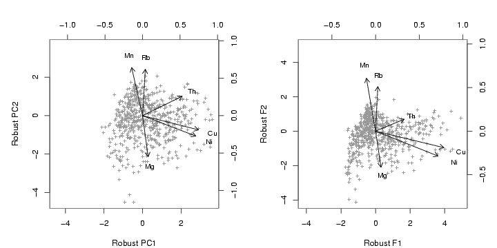 library(StatDA) data(moss) sel=c("Ag","Al","As","B","Ba","Bi","Ca","Cd","Co","Cr","Cu","Fe","Hg","K","Mg", "Mn","Mo","Na","Ni","P","Pb","Rb","S","Sb","Si","Sr","Th","Tl","U","V","Zn") x=log10(moss[,sel]) var=c("Ni","Cu","Mg","Rb","Mn","Th") x=x[,var] set.seed(100) x.mcd=covMcd(x,cor=TRUE) x.rsc=scale(x,x.mcd$cent,sqrt(diag(x.mcd$cov))) #robust PCA res0=pfa(x.rsc,factors=2,covmat=x.mcd,scores="regression",rotation="varimax", maxit=0,start=rep(0,ncol(x.rsc))) # robust PFA res1=pfa(x.rsc,factors=2,covmat=x.mcd,scores="regression",rotation="varimax") pdf("fig-14-9.pdf",width=10,height=5) par(mfcol=c(1,2),mar=c(4,4,4,2)) par(pty="s") biplot(res0$sco[,1:2],res0$loa[,1:2], xlab="Robust PC1",ylab="Robust PC2",col=c(gray(0.6),1),xlabs=rep("+",nrow(x)),cex=0.8) biplot(res1$sco[,1:2],res1$loa[,1:2], xlab="Robust F1",ylab="Robust F2",col=c(gray(0.6),1),xlabs=rep("+",nrow(x)),cex=0.8) dev.off() |