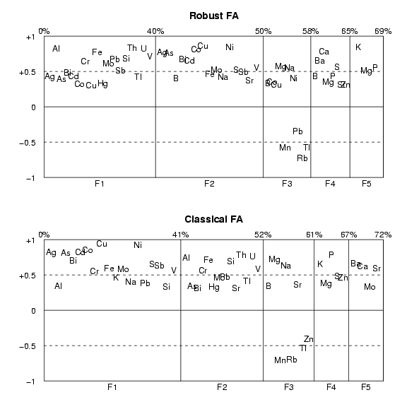 library(StatDA) data(moss) data(kola.background) X=moss[,"XCOO"] Y=moss[,"YCOO"] sel=c("Ag","Al","As","B","Ba","Bi","Ca","Cd","Co","Cr","Cu","Fe","Hg","K","Mg", "Mn","Mo","Na","Ni","P","Pb","Rb","S","Sb","Si","Sr","Th","Tl","U","V","Zn") x=log10(moss[,sel]) set.seed(100) x.mcd=covMcd(x,cor=TRUE) # robust scaling x.rsc=scale(x,x.mcd$cent,sqrt(diag(x.mcd$cov))) # robust PFA res=pfa(x.rsc,factors=5,covmat=x.mcd,scores="regression",rotation="varimax") # classical PFA res1=pfa(scale(x),factors=5,scores="regression",rotation="varimax") pdf("fig-14-13.pdf",width=8,height=8) par(mfrow=c(2,1),mar=c(2,3,3,1)) loadplot(res,titlepl="Robust FA", crit=0.3) loadplot(res1,titlepl="Classical FA", crit=0.3) dev.off() |