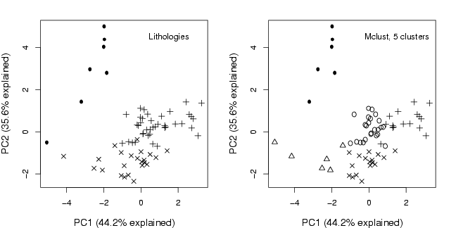library(StatDA) data(chorizon) el=c("Ca","Zn","Mg","Cu","Sr","Na") x=chorizon[,el] sel=((chorizon[,"LITO"]==7) | (chorizon[,"LITO"]==9) | (chorizon[,"LITO"]==82)) grp=chorizon[sel,"LITO"] grp[grp==7] <- 3 grp[grp==9] <- 4 grp[grp==82] <- 20 x=scale(log10(x[sel,])) lab=chorizon[sel,"LITO"] res2=Mclust(x,5:6) res2cl=res2$cl res2cl[res2$cl==5] <- 20 res.pca=princomp(x) expvar=(res.pca$sdev^2)/sum(res.pca$sdev^2) pdf("fig-15-4.pdf",width=9,height=4.5) par(mfrow=c(1,2),mar=c(4,4,2,2)) plot(res.pca$sco[,1:2], xlab=paste("PC1 (",round(expvar[1]*100,1),"% explained)",sep=""), ylab=paste("PC2 (",round(expvar[2]*100,1),"% explained)",sep=""),cex=1.1,cex.lab=1.2, pch=grp) text(1.5,4.5,"Lithologies") plot(res.pca$sco[,1:2], xlab=paste("PC1 (",round(expvar[1]*100,1),"% explained)",sep=""), ylab=paste("PC2 (",round(expvar[2]*100,1),"% explained)",sep=""),cex=1.1,cex.lab=1.2, pch=res2cl) text(1.5,4.5,"Mclust, 5 clusters") dev.off() |