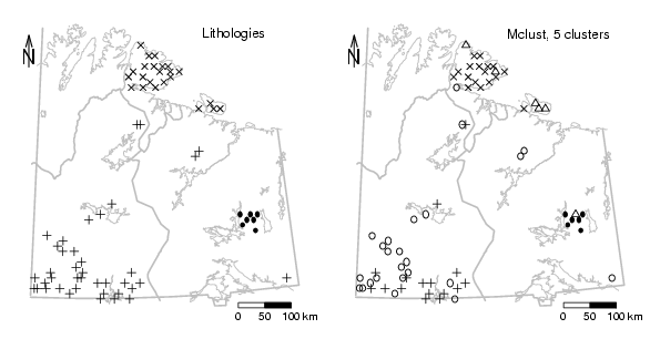 library(StatDA) data(chorizon) el=c("Ca","Zn","Mg","Cu","Sr","Na") x=chorizon[,el] sel=((chorizon[,"LITO"]==7) | (chorizon[,"LITO"]==9) | (chorizon[,"LITO"]==82)) grp=chorizon[sel,"LITO"] grp[grp==7] <- 3 grp[grp==9] <- 4 grp[grp==82] <- 20 x=scale(log10(x[sel,])) lab=chorizon[sel,"LITO"] res2=Mclust(x,5:6) res2cl=res2$cl res2cl[res2$cl==5] <- 20 X=chorizon[,"XCOO"] Y=chorizon[,"YCOO"] # true representation of x and y axis of map for plot xwid=diff(range(X))/12e4 ywid=diff(range(Y))/12e4 pdf("fig-15-5.pdf",width=2*xwid,height=1*ywid) par(mfrow=c(1,2),mar=c(1.5,1.5,1.5,1.5)) # NEW MAP plot(X,Y,frame.plot=FALSE,xaxt="n",yaxt="n",xlab="",ylab="",type="n") data(kola.background) plotbg(map.col=c("gray","gray","gray","gray"),add.plot=T) points(chorizon[sel,"XCOO"],chorizon[sel,"YCOO"],col=1,pch=grp) # Legend text(752000,7880000,"Lithologies",cex=1) # scalebar scalebar(761309,7373050,861309,7363050,shifttext=-0.5,shiftkm=37e3,sizetext=0.8) # North arrow Northarrow(362602,7818750,362602,7878750,362602,7838750,Alength=0.15,Aangle=15,Alwd=1.3,Tcex=1.6) # NEW MAP plot(X,Y,frame.plot=FALSE,xaxt="n",yaxt="n",xlab="",ylab="",type="n") plotbg(map.col=c("gray","gray","gray","gray"),add.plot=T) points(chorizon[sel,"XCOO"],chorizon[sel,"YCOO"],col=1,pch=res2cl) # Legend text(752000,7880000,"Mclust, 5 clusters",cex=1) # scalebar scalebar(761309,7373050,861309,7363050,shifttext=-0.5,shiftkm=37e3,sizetext=0.8) # North arrow Northarrow(362602,7818750,362602,7878750,362602,7838750,Alength=0.15,Aangle=15,Alwd=1.3,Tcex=1.6) dev.off() |