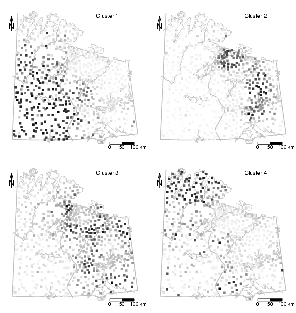 library(StatDA) data(moss) data(kola.background) el=c("Cu","Ni","Mg","Sr") x=scale(log10(moss[,el])) set.seed(100) res=cmeans(x,4) X=moss[,"XCOO"] Y=moss[,"YCOO"] # true representation of x and y axis of map for plot xwid=diff(range(X))/12e4 ywid=diff(range(Y))/12e4 pdf("fig-15-6.pdf",width=2*xwid,height=2*ywid) par(mfrow=c(2,2),mar=c(1.5,1.5,1.5,1.5)) # NEW MAP plot(X,Y,frame.plot=FALSE,xaxt="n",yaxt="n",xlab="",ylab="",type="n") plotbg(map.col=c("gray","gray","gray","gray"),add.plot=T) points(moss[,"XCOO"],moss[,"YCOO"],col=gray(1-res$mem[,1]),pch=15,cex=1) # Legend text(752000,7880000,"Cluster 1",cex=1.1) # scalebar scalebar(761309,7373050,861309,7363050,shifttext=-0.5,shiftkm=37e3,sizetext=0.8) # North arrow Northarrow(362602,7818750,362602,7878750,362602,7838750,Alength=0.15,Aangle=15,Alwd=1.3,Tcex=1.6) # NEW MAP plot(X,Y,frame.plot=FALSE,xaxt="n",yaxt="n",xlab="",ylab="",type="n") plotbg(map.col=c("gray","gray","gray","gray"),add.plot=T) points(moss[,"XCOO"],moss[,"YCOO"],col=gray(1-res$mem[,2]),pch=15,cex=1) # Legend text(752000,7880000,"Cluster 2",cex=1.1) # scalebar scalebar(761309,7373050,861309,7363050,shifttext=-0.5,shiftkm=37e3,sizetext=0.8) # North arrow Northarrow(362602,7818750,362602,7878750,362602,7838750,Alength=0.15,Aangle=15,Alwd=1.3,Tcex=1.6) # NEW MAP plot(X,Y,frame.plot=FALSE,xaxt="n",yaxt="n",xlab="",ylab="",type="n") plotbg(map.col=c("gray","gray","gray","gray"),add.plot=T) points(moss[,"XCOO"],moss[,"YCOO"],col=gray(1-res$mem[,3]),pch=15,cex=1) # Legend text(752000,7880000,"Cluster 3",cex=1.1) # scalebar scalebar(761309,7373050,861309,7363050,shifttext=-0.5,shiftkm=37e3,sizetext=0.8) # North arrow Northarrow(362602,7818750,362602,7878750,362602,7838750,Alength=0.15,Aangle=15,Alwd=1.3,Tcex=1.6) # NEW MAP plot(X,Y,frame.plot=FALSE,xaxt="n",yaxt="n",xlab="",ylab="",type="n") plotbg(map.col=c("gray","gray","gray","gray"),add.plot=T) points(moss[,"XCOO"],moss[,"YCOO"],col=gray(1-res$mem[,4]),pch=15,cex=1) # Legend text(752000,7880000,"Cluster 4",cex=1.1) # scalebar scalebar(761309,7373050,861309,7363050,shifttext=-0.5,shiftkm=37e3,sizetext=0.8) # North arrow Northarrow(362602,7818750,362602,7878750,362602,7838750,Alength=0.15,Aangle=15,Alwd=1.3,Tcex=1.6) dev.off() |