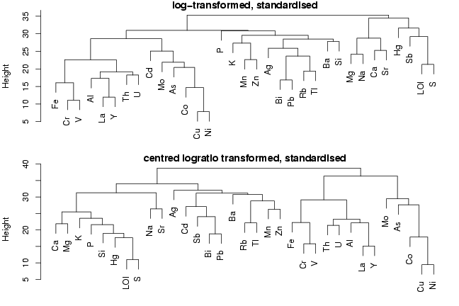 library(StatDA) data(ohorizon) el=c("Ag","Al","As","Ba","Bi","Ca","Cd","Co","Cr","Cu","Fe","Hg","K", "La","Mg","Mn","Mo","LOI","Na","Ni","P","Pb","Rb","S","Sb","Si","Sr","Th", "Tl","U","V","Y","Zn") x=t(scale(log10(ohorizon[,el]))) res=hclust(dist(x),method="average") pdf("fig-15-7.pdf",width=9,height=6) par(mfrow=c(2,1),mar=c(1,4,1,1)) plot(res,sub="",main="log-transformed, standardised", xlab="") # Closure problem with log-centring transformation x=ohorizon[,el] xgeom=10^apply(log10(x),1,mean) x2=x/xgeom x2.obj=log10(x2) x.lc=t(scale(x2.obj)) res.lc=hclust(dist(x.lc),method="average") par(mar=c(1,4,1,1)) plot(res.lc,sub="",main="centred logratio transformed, standardised", xlab="") dev.off() |