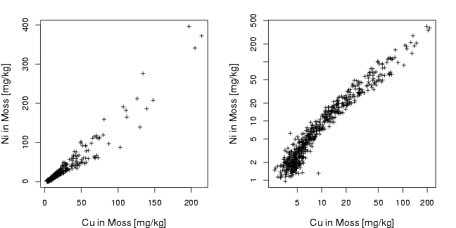 library(StatDA) data(moss) # Country Cu=moss[,"Cu"] Ni=moss[,"Ni"] pdf("fig-16-4.pdf",width=9,height=4.5) par(mfrow=c(1,2),mar=c(4,4,2,2)) plot(Cu,Ni,xlab="Cu in Moss [mg/kg]", ylab="Ni in Moss [mg/kg]",pch=3, cex=0.7,cex.lab=1.2) plot(log10(Cu),log10(Ni),xlab="Cu in Moss [mg/kg]", ylab="Ni in Moss [mg/kg]", xaxt="n", yaxt="n", pch=3, cex=0.7,cex.lab=1.2) axis(1,at=log10(a<-sort(c((10^(-50:50))%*%t(c(2,5,10))))),labels=a) axis(2,at=log10(a<-sort(c((10^(-50:50))%*%t(c(2,5,10))))),labels=a) #text(log10(9.1),-0.02,moss[30,"ID"]) #text(log10(3.3),0.8,moss[31,"ID"]) dev.off() |