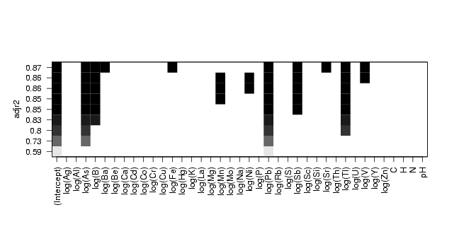 library(StatDA) data(ohorizon) attach(ohorizon) sel <- c("Ag","Al","As","B","Ba","Be","Bi","Ca","Cd","Co","Cr","Cu","Fe","Hg","K","La","Mg","Mn","Mo","Na", "Ni","P","Pb","Rb","S","Sb","Sc","Si","Sr","Th","Tl","U","V","Y","Zn","C","H","N","pH") ohorizon.red <- ohorizon[,sel] ohorizon.red <- na.omit(ohorizon.red) # full model using 38 variables: lm.full=lm(log(Bi)~log(Ag)+log(Al)+log(As)+log(B)+log(Ba)+log(Be)+log(Ca)+log(Cd)+ log(Co)+log(Cr)+log(Cu)+log(Fe)+log(Hg)+log(K)+log(La)+log(Mg)+log(Mn)+log(Mo)+log(Na)+ log(Ni)+log(P)+log(Pb)+log(Rb)+log(S)+log(Sb)+log(Sc)+log(Si)+log(Sr)+log(Th)+log(Tl)+ log(U)+log(V)+log(Y)+log(Zn)+C+H+N+pH,data=ohorizon.red) summary(lm.full) # empty model: lm.0=lm(log(Bi)~1,data=ohorizon.red) # stepwise regressions: #backward step.b=step(lm.full,data=ohorizon.red,direction="backward") summary(step.b) #forward step.f=step(lm.0,scope=lm.full$call$formula,data=ohorizon.red,direction="forward") summary(step.f) #both directions step.both=step(lm.full,direction="both") summary(step.both) # leaps and bound: res=regsubsets(log(Bi)~log(Ag)+log(Al)+log(As)+log(B)+log(Ba)+log(Be)+log(Ca)+log(Cd)+ log(Co)+log(Cr)+log(Cu)+log(Fe)+log(Hg)+log(K)+log(La)+log(Mg)+log(Mn)+log(Mo)+log(Na)+ log(Ni)+log(P)+log(Pb)+log(Rb)+log(S)+log(Sb)+log(Sc)+log(Si)+log(Sr)+log(Th)+log(Tl)+ log(U)+log(V)+log(Y)+log(Zn)+C+H+N+pH,data=ohorizon.red, nbest=1,nvmax=9) # plot result: pdf("fig-16-10.pdf",width=9,height=4.5) plot(res,scale="adjr2") dev.off() # linear model with best 4 variables: classical lm.new=lm(log(Bi)~log(Pb)+log(As)+log(Tl)+log(B),data=ohorizon) summary(lm.new) # linear model with best 4 variables: robust lts.new=ltsReg(log(Bi)~log(Pb)+log(As)+log(Tl)+log(B),data=ohorizon) summary(lts.new) |