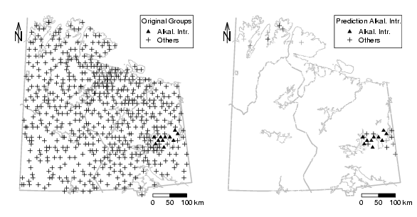 library(StatDA) data(chorizon) data(kola.background) lit=chorizon[,"LITO"] Region=rep(1, length(lit)) Region[lit==82] <- 3 Region[lit==83] <- 3 X=chorizon[,"XCOO"] Y=chorizon[,"YCOO"] XY=cbind(X,Y) # cut region xcent=c(800000,7535000) sel=sqrt((X-xcent[1])^2+(Y-xcent[2])^2)<70000 # true representation of x and y axis of map for plot xwid=diff(range(X))/12e4 ywid=diff(range(Y))/12e4 pdf("fig-17-5.pdf",width=2*xwid,height=1*ywid) par(mfrow=c(1,2),mar=c(1.5,1.5,1.5,1.5)) el <- c("Al_XRF","Ca_XRF","Fe_XRF","K_XRF","Mg_XRF","Mn_XRF","Na_XRF","P_XRF","Si_XRF","Ti_XRF") x=chorizon[,el] # log-ratio x1=x/x[,"Ti_XRF"] x=log10(x1[,1:9]) x=scale(x) ####################################################################################### # LDA ####################################################################################### set.seed(100) x.lda=lda(x, Region, prior=c(0.5,0.5), CV=TRUE) cl=x.lda$class pt=x.lda$post plot(X,Y,frame.plot=FALSE,xaxt="n",yaxt="n",xlab="",ylab="",type="n") plotbg(map.col=c("gray","gray","gray","gray"),add.plot=T) points(XY[Region==3,],pch=17,cex=0.8) points(XY[Region==1,],pch=3,cex=0.8) legend("topright",pch=c(17,3),pt.cex=c(0.8,0.8), legend=c("Alkal. Intr.", "Others"), cex=0.8,title="Original Groups") # scalebar scalebar(761309,7373050,861309,7363050,shifttext=-0.5,shiftkm=37e3,sizetext=0.8) # North arrow Northarrow(362602,7818750,362602,7878750,362602,7838750,Alength=0.15,Aangle=15,Alwd=1.3,Tcex=1.6) ####################################################################################### # Results Group 1 # generate plot with background plot(X,Y,frame.plot=FALSE,xaxt="n",yaxt="n",xlab="",ylab="",type="n") plotbg(map.col=c("gray","gray","gray","gray"),add.plot=T) v.red=Region points(XY[v.red==3,],pch=17,cex=0.8,col=gray(1-pt[v.red==3,2])) points(XY[v.red==1,],pch=3,cex=0.8,col=gray(1-pt[v.red==1,2])) legend("topright",pch=c(17,3),pt.cex=c(0.8,0.8), legend=c("Alkal. Intr.","Others"), cex=0.8,title="Prediction Alkal. Intr.") # scalebar scalebar(761309,7373050,861309,7363050,shifttext=-0.5,shiftkm=37e3,sizetext=0.8) # North arrow Northarrow(362602,7818750,362602,7878750,362602,7838750,Alength=0.15,Aangle=15,Alwd=1.3,Tcex=1.6) dev.off() |