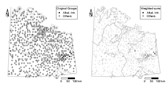 library(StatDA) data(chorizon) data(kola.background) var=c("Si_XRF","Al_XRF","K_XRF","LOI","P","Mn") ri=c(-2.0,1.5,2.0,2.0,3.0,2.0) x=chorizon[,var] res=rg.wtdsums(x,ri) ws=res$ws wss=(ws-min(ws))/(max(ws)-min(ws)) lit=chorizon[,"LITO"] Region=rep(1, length(lit)) Region[lit==82] <- 3 Region[lit==83] <- 3 X=chorizon[,"XCOO"] Y=chorizon[,"YCOO"] XY=cbind(X,Y) # true representation of x and y axis of map for plot xwid=diff(range(X))/12e4 ywid=diff(range(Y))/12e4 pdf("fig-17-7.pdf",width=2*xwid,height=1*ywid) par(mfrow=c(1,2),mar=c(1.5,1.5,1.5,1.5)) plot(X,Y,frame.plot=FALSE,xaxt="n",yaxt="n",xlab="",ylab="",type="n") plotbg(map.col=c("gray","gray","gray","gray"),add.plot=T) points(XY[Region==3,],pch=17,cex=0.8) points(XY[Region==1,],pch=3,cex=0.8) legend("topright",pch=c(17,3),pt.cex=c(0.8,0.8), legend=c("Alkal. Intr.", "Others"), cex=0.8,title="Original Groups") # scalebar scalebar(761309,7373050,861309,7363050,shifttext=-0.5,shiftkm=37e3,sizetext=0.8) # North arrow Northarrow(362602,7818750,362602,7878750,362602,7838750,Alength=0.15,Aangle=15,Alwd=1.3,Tcex=1.6) ####################################################################################### # Results Group 1 # generate plot with background plot(X,Y,frame.plot=FALSE,xaxt="n",yaxt="n",xlab="",ylab="",type="n") plotbg(map.col=c("gray","gray","gray","gray"),add.plot=T) points(XY[Region==3,],pch=17,cex=0.8,col=gray(1-wss[Region==3])) points(XY[Region==1,],pch=3,cex=0.8,col=gray(1-wss[Region==1])) legend("topright",pch=c(17,3),pt.cex=c(0.8,0.8), legend=c("Alkal. Intr.","Others"), cex=0.8,title="Weighted sums") # scalebar scalebar(761309,7373050,861309,7363050,shifttext=-0.5,shiftkm=37e3,sizetext=0.8) # North arrow Northarrow(362602,7818750,362602,7878750,362602,7838750,Alength=0.15,Aangle=15,Alwd=1.3,Tcex=1.6) dev.off() |