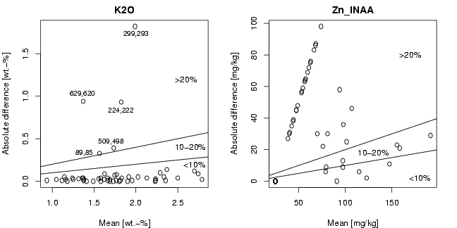 # Fig. 18.2.: Thompson-Howarth plot of duplicates for K2O and Zn_INAA
