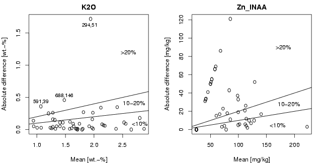 library(StatDA) # Field duplicates data(CHorFieldDUP) xd1=CHorFieldDUP[,5:98] xd2=CHorFieldDUP[,99:192] pdf("fig-18-3.pdf",width=9,height=4.5) par(mfrow=c(1,2),mar=c(4,4,2,2)) i=39 xmean=apply(cbind(xd1[,i],xd2[,i]),1,mean) xdiff=abs(xd1[,i]-xd2[,i]) xmax=max(xmean) ymax=max(xdiff) plot(xmean,xdiff,main="K2O",xlab="Mean [wt.-%]",ylab="Absolute difference [wt.-%]", ylim=c(0,ymax)) abline(a=0,b=0.1) abline(a=0,b=0.2) text(2.8,0.09,"<10%") text(2.7,0.41,"10-20%") text(2.6,1.2,">20%") # label observations text(1.07,0.43,"591,39",cex=0.85) text(1.92,1.62,"294,51",cex=0.85) text(1.48,0.53,"688,146",cex=0.85) i=94 xmean=apply(cbind(xd1[,i],xd2[,i]),1,mean) xdiff=abs(xd1[,i]-xd2[,i]) xmax=max(xmean) ymax=max(xdiff) plot(xmean,xdiff,main="Zn_INAA",xlab="Mean [mg/kg]",ylab="Absolute difference [mg/kg]", ylim=c(0,ymax)) abline(a=0,b=0.1) abline(a=0,b=0.2) text(170,5,"<10%") text(190,28,"10-20%") text(180,90,">20%") dev.off() |