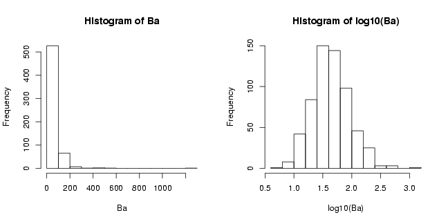 # Figure 19.1.: histogram of Ba and log10(Ba) in C-horizon