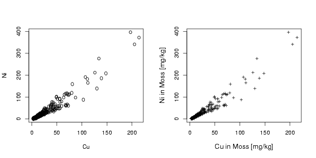 library(StatDA) data(moss) Cu=moss[,"Cu"] Ni=moss[,"Ni"] pdf("fig-19-2.pdf",width=9,height=4.5) par(mfrow=c(1,2)) plot(Cu,Ni) plot(Cu,Ni,xlab="Cu in Moss [mg/kg]", ylab="Ni in Moss [mg/kg]",pch=3, cex=0.7,cex.lab=1.2) dev.off() |